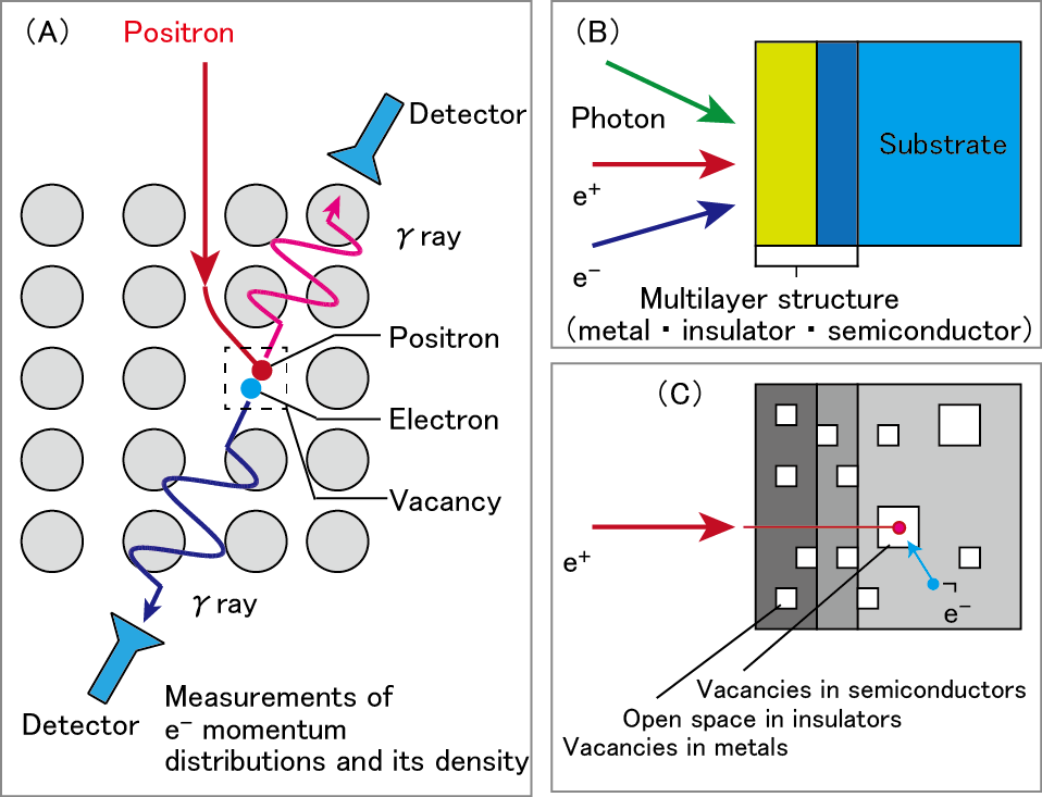Positron annihilation is a non-destructive detection tool for vacancy-type defects or open spaces in materials (Figure A). Using this technique, one can study such singularity structures with high sensitivity, and determine their species, concentrations and depth distributions. The purpose of the present research as follows; (i) a study of carrier trapping/scattering phenomena and their optical reactions, and (ii) developments of the measurement system in order to use a positron as a probe of electric field (Figure B and C). Measurement systems equipped with positron beam, illumination system, electron beam, and bias applying electronics are installed at University of Tsukuba and National Institute of Advanced Industrial Science and Technology. We use the positron annihilation spectroscopy to study properties of the singularity structures from a view of material science, and propose guidelines for the fabrication of electric devices using such structures.