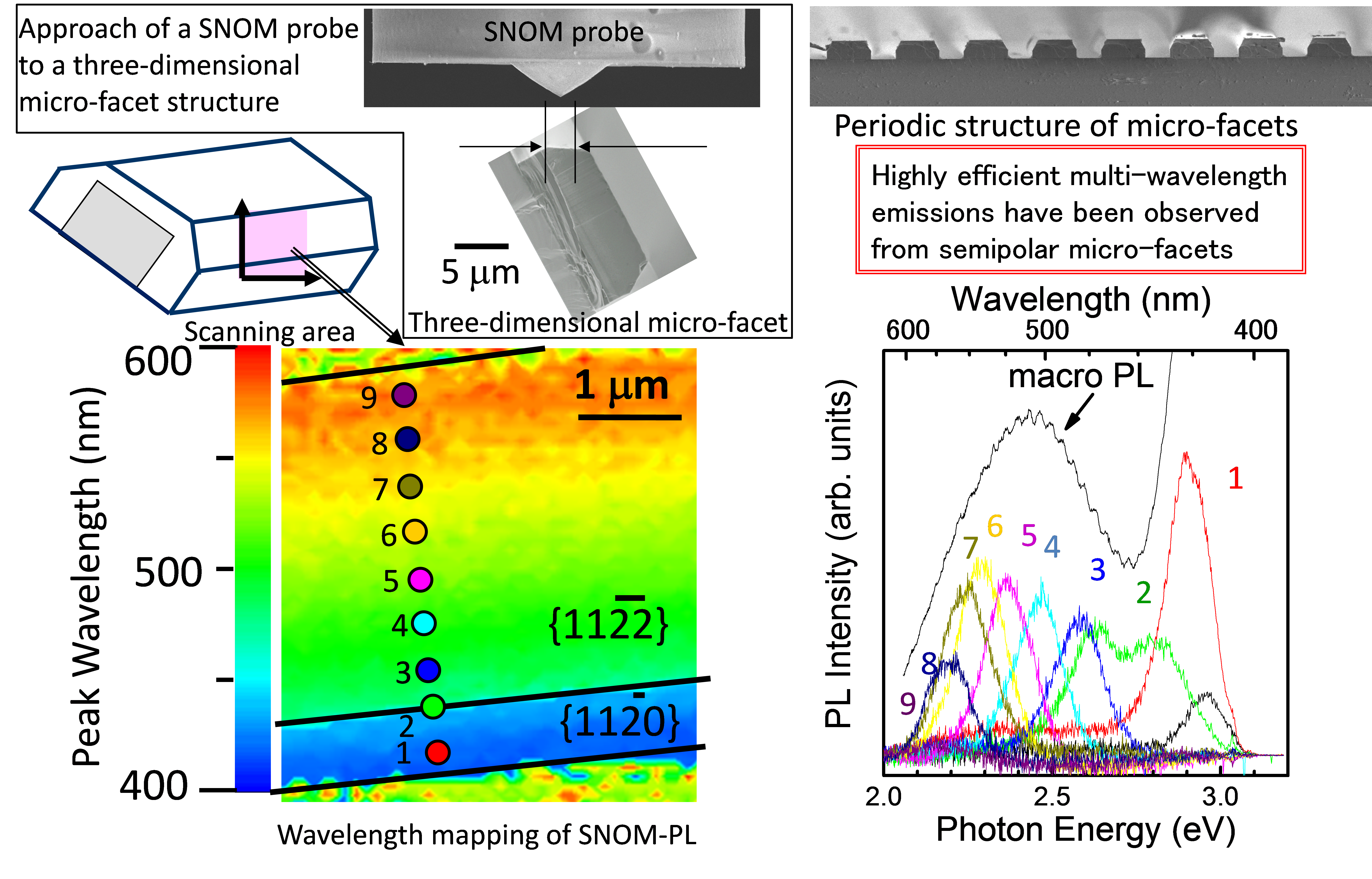 We strive to clarify the design concept of light emitting devices with the ultimate goal of achieving 100% internal quantum efficiency in the full visible spectrum by focusing on singularity structures such as semipolar micofacets and nanocolumns in (Al,Ga,In)N-based three-dimensional semiconductors. To assess InGaN-based nanostructures and elucidate the mechanism of radiative recombination in singularity structures by visualization of exciton and carrier motions, we employ original laboratory-made SNOM (scanning near-field optical microscopy) systems, including DSNOM (dual-probe SNOM). Moreover, we plan to establish a near-field technique in the DUV (deep ultraviolet) spectra by developing an optical probe material capable of guiding DUV light with a highly efficient transmittance. These efforts should lead to the study of spatially and temporally resolved recombination dynamics in AlGaN-based and InGaN-based nanostructures. Furthermore, we focus on the effect of plasmonics, where the controllability of the emission wavelength and the key for high emission efficiency will be characterized in compositionally modulated singularity structures. These studies should help realize next-generation devices such as phosphor-free tailor-made lighting and highly efficient DUV emitters due to the clear design concept of singularity structures intended to control the optical functionalities.