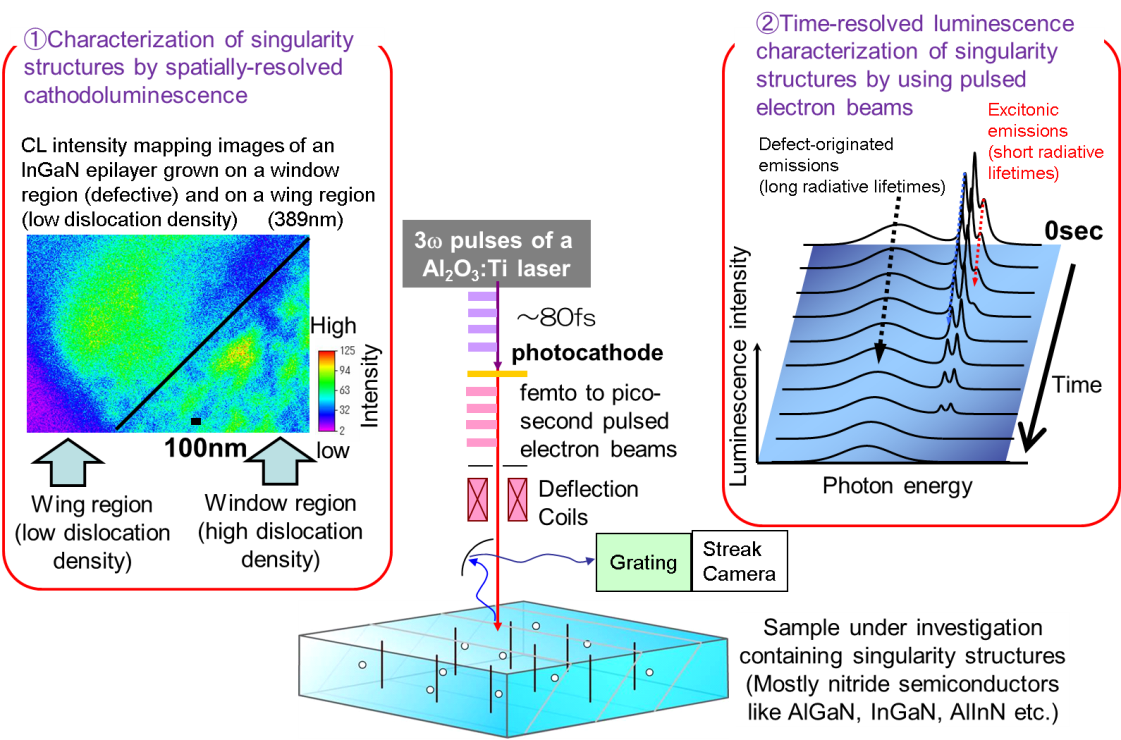 Singularity structures including imperfections as well as inhomogeneity contain various types of heterointerfaces within the bulk and/or surfaces. For understanding local carrier and/or emission dynamics in such structures, probing local emission dynamics by using a method that picks off them is mandatory. Our principal task in this singularity project is obtaining the images of multiple mapping of luminescence intensity, energy, and lifetime by using our unique 'Spatio-Time-Resolved Cathodoluminescence (STRCL)' system. This system is basically composed of a cathodoluminescence (CL) measurement system equipped on a scanning electron microscopy (SEM), but its electron beam (e-beam) gun is replaced by a pulsed photoelectron (PE) gun made of Au, which is excited using the frequency-tripled femtosecond pulses of mode-locked Al2O3:Ti laser. Because e-beam pulses are used as an excitation source, STRCL has principally no limitation on the bandgap energy of a material to be measured. We will collaborate with all groups to assess the carrier recombination dynamics and quantum effects in the singularity structures for creating new optoelectronic sciences in semiconductors.