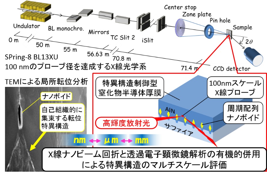 高輝度放射光による100nm空間分解能とサブナノ秒時間分解能を有するその場X線回折法は、半導体結晶やデバイスに存在する歪やドメインの広範囲局所領域精密計測を実現し、格子欠陥の極微構造や3次元空間分布を検出する透過電子顕微鏡法等との有機的併用によって、ナノメートル~ミリメートルにわたるマルチスケール構造評価を可能とします。本研究では、特に窒化物半導体結晶中のナノボイドや転位、圧電分極に影響する極性/非極性格子等の特異構造に着目し、他グループで開発された特異構造制御型窒化物結晶やデバイスを対象に、3次元精密構造解析を行います。また、その場観測技術を駆使して、電場等外部刺激に応答する特異構造のダイナミクスを解明することで、特異構造が結晶特性・デバイス特性に及ぼす能動的機能を探索します。それによって窒化物結晶の飛躍的な機能向上を図り、拡張結晶学の学術的構築と新規グリーンエレクトロニクスの創成に貢献します。