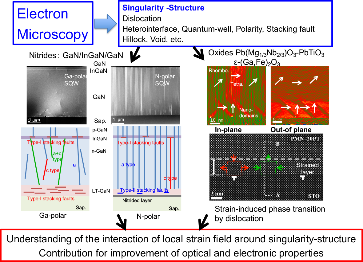 窒化物・酸化物半導体薄膜では、転位など格子欠陥やエピタキシャル成長に伴う残留歪みといった特異構造に付随する周期性や結合状態の乱れやそれらの空間的な分布状態は結晶成長や発光デバイスやパワーエレクトロニクスの性質に大きな影響を及ぼします。本研究では、貫通転位に代表される結晶の非完全性がもたらす局所弾性場が発光デバイスの要である量子井戸構造に及ぼす影響を局所構造・電子状態やマクロな形態をマルチスケールで調べ、非破壊3次元構造解析グループと相補的な立場から特異構造の解明に取り組みます。