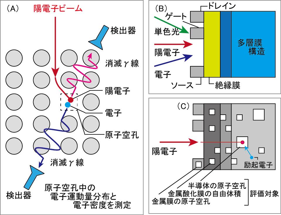 陽電子消滅は、特異構造である原子空孔を感度良く非破壊で検出、その種類、濃度、深さ分布を決定できる手法です(図(A))。本研究の目的は、(i)空孔のキャリア捕獲による励起状態を検出する手法を開発し、その光応答性を研究すること、また(ii)陽電子がヘテロ構造や表面に存在する電界に敏感に反応する正の点電荷であることを利用して、陽電子を電界プローブとして使用するための装置を構築することです(図B及びC)。陽電子ビーム、単色光、電子ビーム、また電圧印加システム等からなるビームラインを開発し、上記の目的を達成します。既存の陽電子実験装置、また新たに開発した装置を駆使し、同領域研究者との密接な協力関係をもとに、特異構造の物性を学術的な観点から研究します。また、これを制御する手法を提案、デバイス設計指針を提供します。